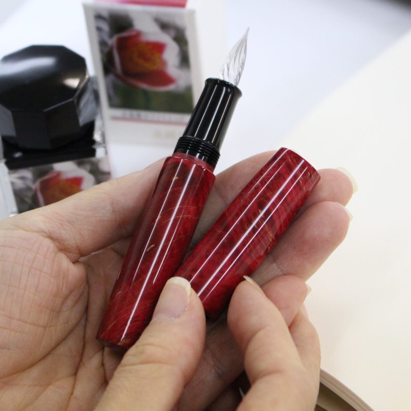 今回そんな五島椿をモチーフに、台湾のジュエリーデザイナーLai氏が手がけるペンブランド『Ya-Ching Style』とコラボし、見た目も書き味も最高のスタビライズドウッド ガラス万年筆を作りました。