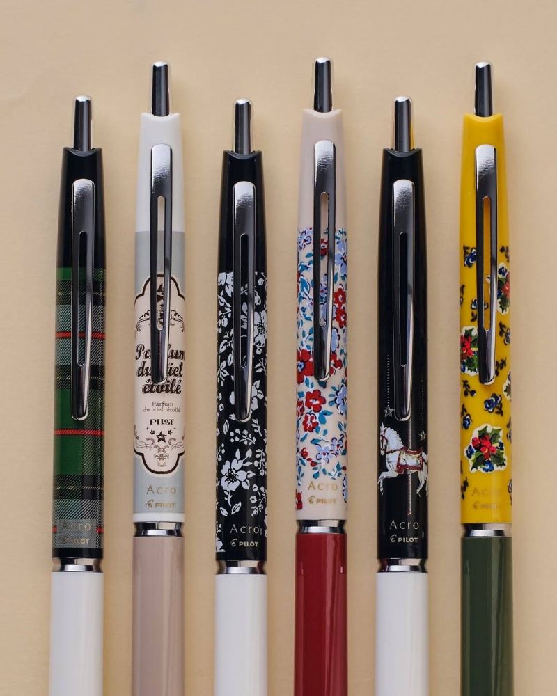 パイロットの油性ボールペン「Acroクリスマスマーケット」です。ヨーロッパの伝統的なクリスマスマーケットのあたたかな雰囲気を彷彿とさせる、6種類のビンテージ風デザイン。まるで蚤の市で見つけたお宝をひとつずつ手に取るような楽しさがあります。